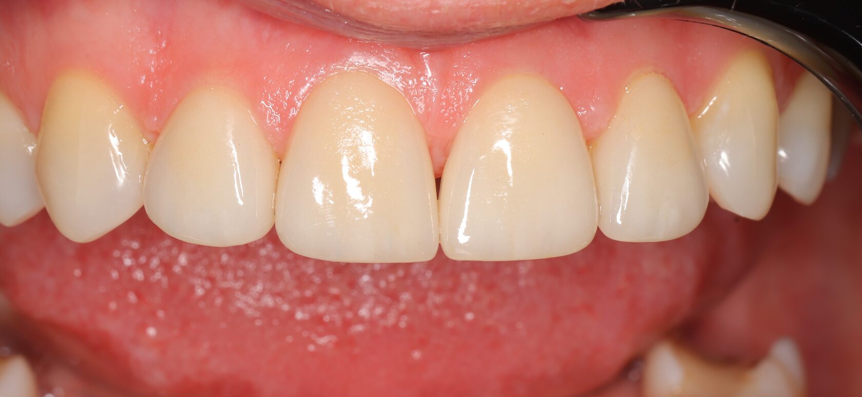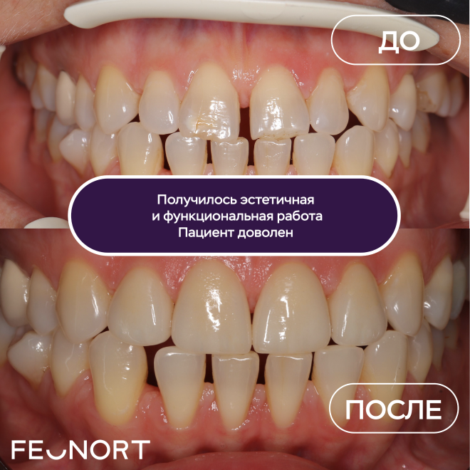 И уже далее были изготовлены постоянные керамические конструкции, которые мы фиксировали в несколько этапов. Сначала обработка зубов, фиксация временных виниров и потом уже фиксация постоянных.