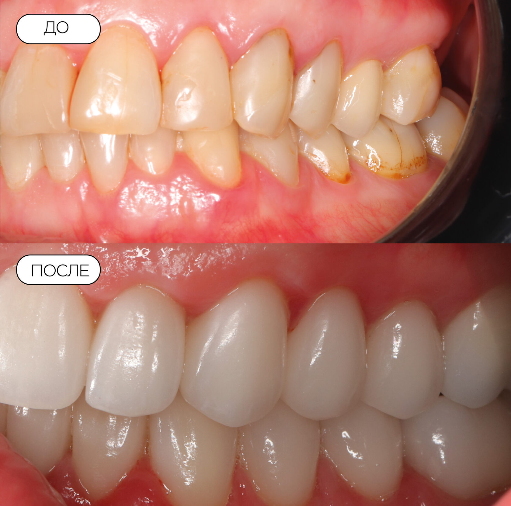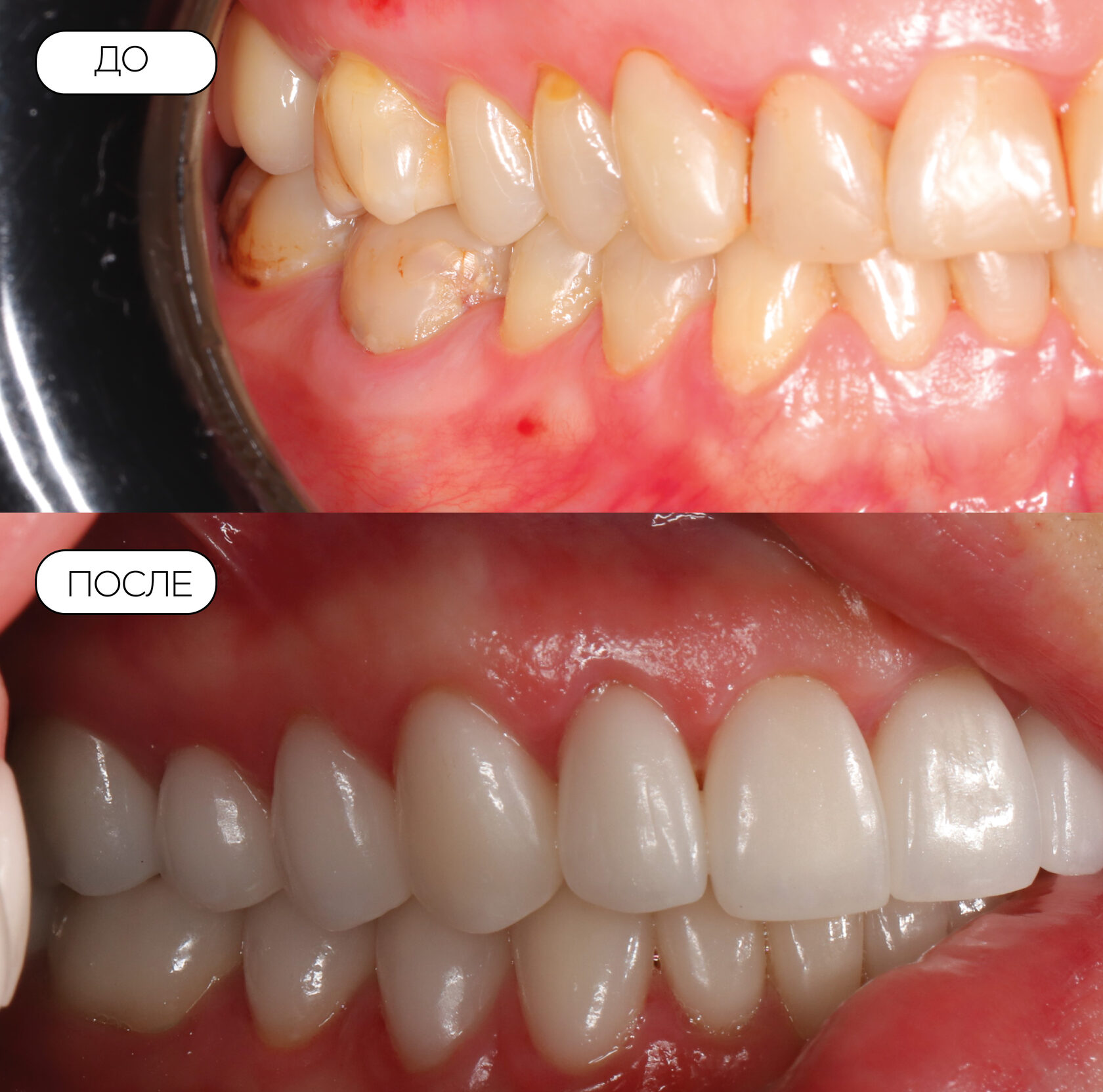 Сначала провели профессиональную гигиену полости рта, пролечили кариес и уже дальше врач ортопед приступил к восстановлению улыбки керамическими реставрациями.