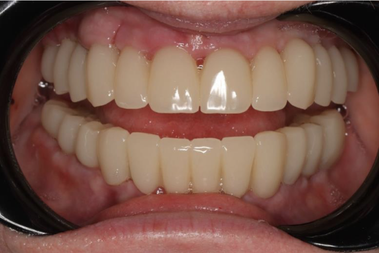 Готово! Полноценные зубные ряды, восстановлено жевание, кусание. Изменилось и помолодело лицо, изменилась речь. Эта конструкция не снимается, пациент пользуется ею на постоянной основе, радуясь своей новой улыбке.