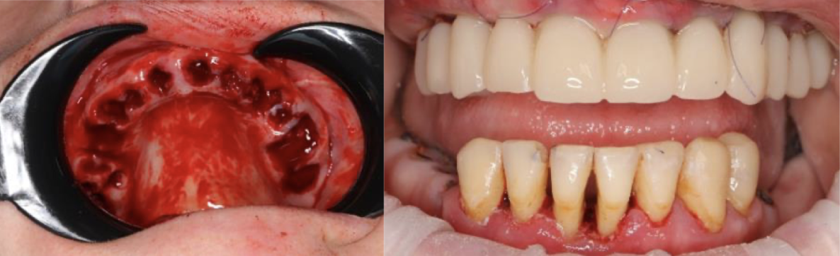 Работа началась с верхней челюсти. Были удалены все зубы, установлено 6 имплантов и сразу зафиксирован временный протез ортопедом.